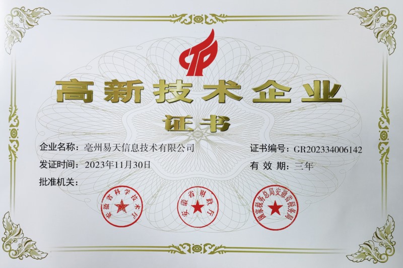 亳州易天信息技術(shù)有限公司于2023年11月30日成功獲得了安徽省科學(xué)技術(shù)廳、安徽省財(cái)政廳、國(guó)家稅務(wù)總局安徽省稅務(wù)局共同頒發(fā)的高新技術(shù)企業(yè)證書(shū),證書(shū)編號(hào):GR202334006142,這是對(duì)公司技術(shù)實(shí)力和創(chuàng)新能力的高度認(rèn)可。